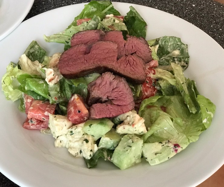 Heute gab es Salat an einer leckeren Kräutersalatsauce und Rindsfilet sous-vide gegart.