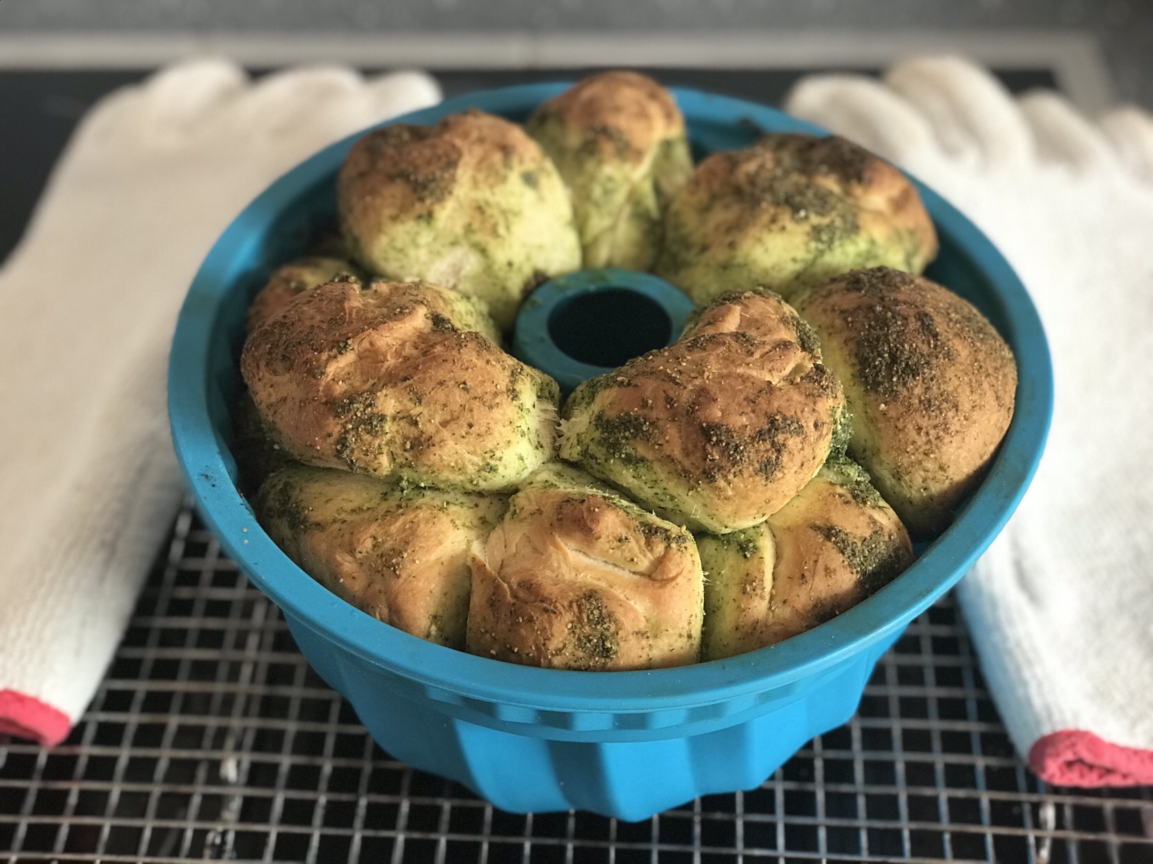 Die Teigkugeln in dem Pesto drehen und in eine Gugelhupfform geben. Den Teig nochmals 1/2 Stunde aufgehen lassen.